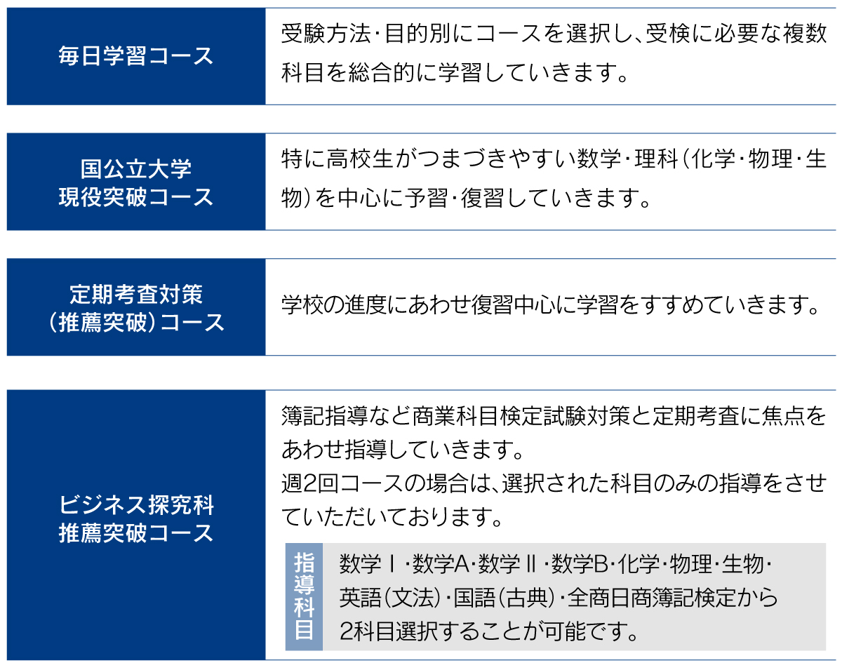 高1・高2 学習コース | 24,200円 | 1,430円 | 原則曜日固定制 (土曜日・日曜日は原則休校) 入塾金11,000円 (小中学部規定に準ずる) 大学入試に必要な全教科受講可 (商業簿記含む) |